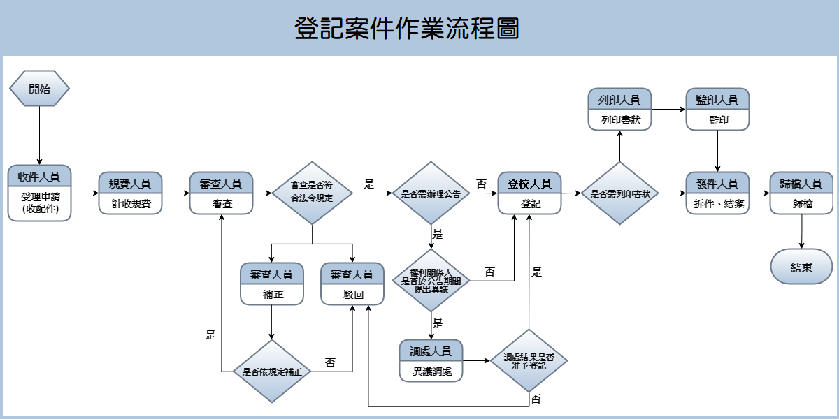 登記案件作業流程如流程圖所示,由申請→收件→計收規費→審查→登錄→校對→印狀→地價異動→結案通知領件→歸檔