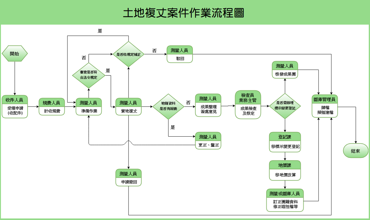 土地複丈案件作業流程如流程圖所示,由申請→收件→計收規費→排定測量時間→實地複丈→成果整理→核發成果圖及登記→歸檔