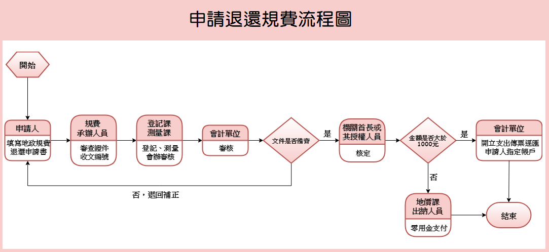 申請規費流程如流程圖所示,先填寫申請書→收文編號→審核→核准→匯入指定帳號或直接支付→結案歸檔